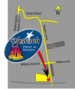 Head towards the River Exe, following the signs for Alphington, Marsh Barton, and Okehampton. On crossing the river, keep to the left lane and turn left at the lights into Haven Road. Follow the road to the right where it becomes Water Lane, you will pass The Range on the left. At the next crossroads, proceed ahead through the "Access only" sign into Tan Lane, and Pharaoh is in the area on the right immediately before the railway bridge.